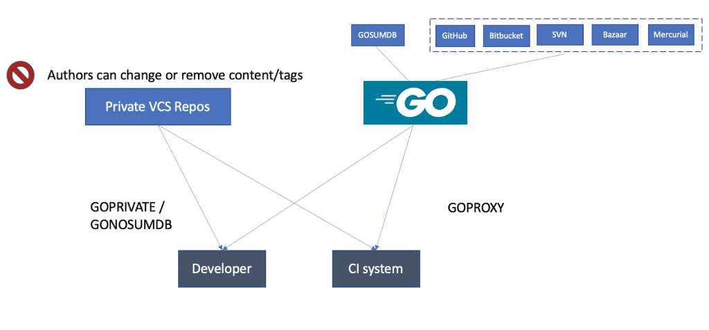 Bei der Entwicklung in Golang vor der GOPROXY-Ära wurden Modul-Abhängigkeiten direkt von ihren Quellcode-Repositories in VCS-Systemen wie GitHub, Bitbucket, Bazaar, Mercurial oder SVN heruntergeladen. Abhängigkeiten von Dritten werden in der Regel aus öffentlichen Quellcode-Repositories heruntergeladen. Private Abhängigkeiten müssen sich bei dem VCS-System authentifizieren, in dem sie gespeichert sind, um die Quelldateien des Moduls herunterzuladen.