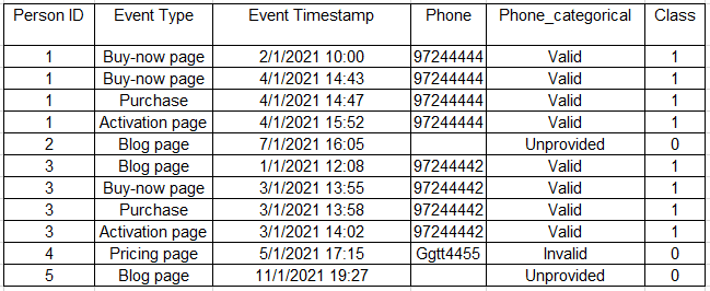 To better understand it, let’s look at the first ID as an example: this person visited two times on the buy-now page (first two rows), purchased the product (third row), and visited once at the activation page (fourth row). He provided a valid phone number. Its class value is one since he purchased the product.