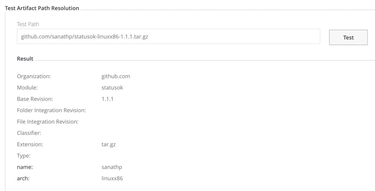 Lorsque vous configurez la topologie personnalisée, il convient de tester la résolution du chemin d’accès à l’artefact pour confirmer comment Artifactory générera les informations du module à partir du chemin d’accès en utilisant les définitions de la topologie.