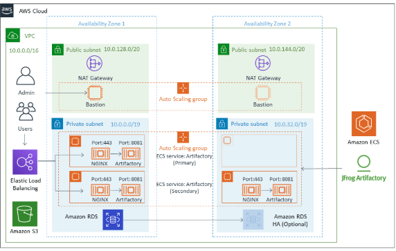このクイックスタートを使用して、Amazon ECSでJFrog Artifactoryを自動で設定してください。デプロイメントには次のものが含まれます。