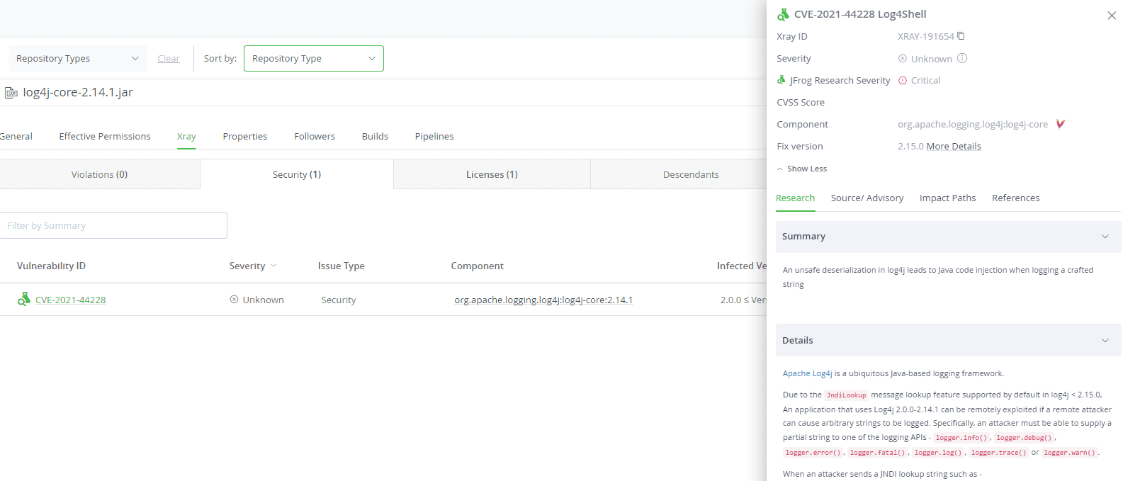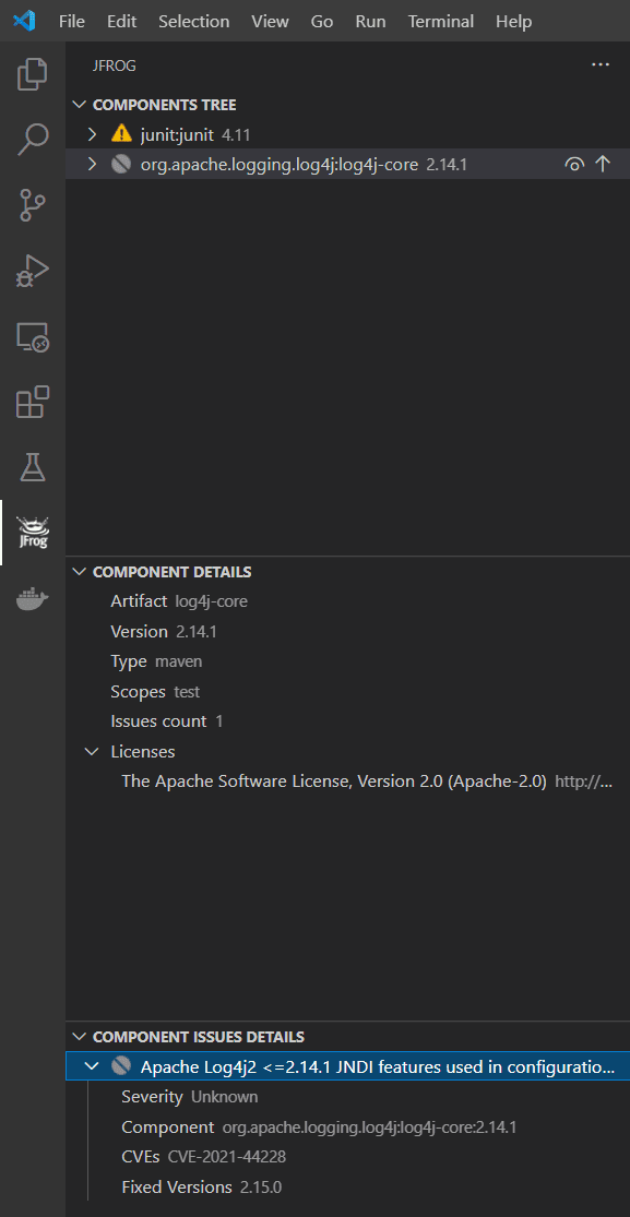 Xray は通常のスキャンにてCVE-2021-44228を検出します。いつものように CI/CD の一環で検出できるわけです。