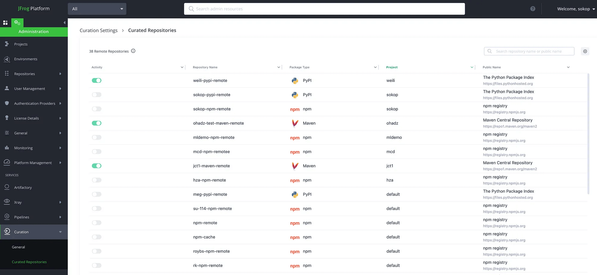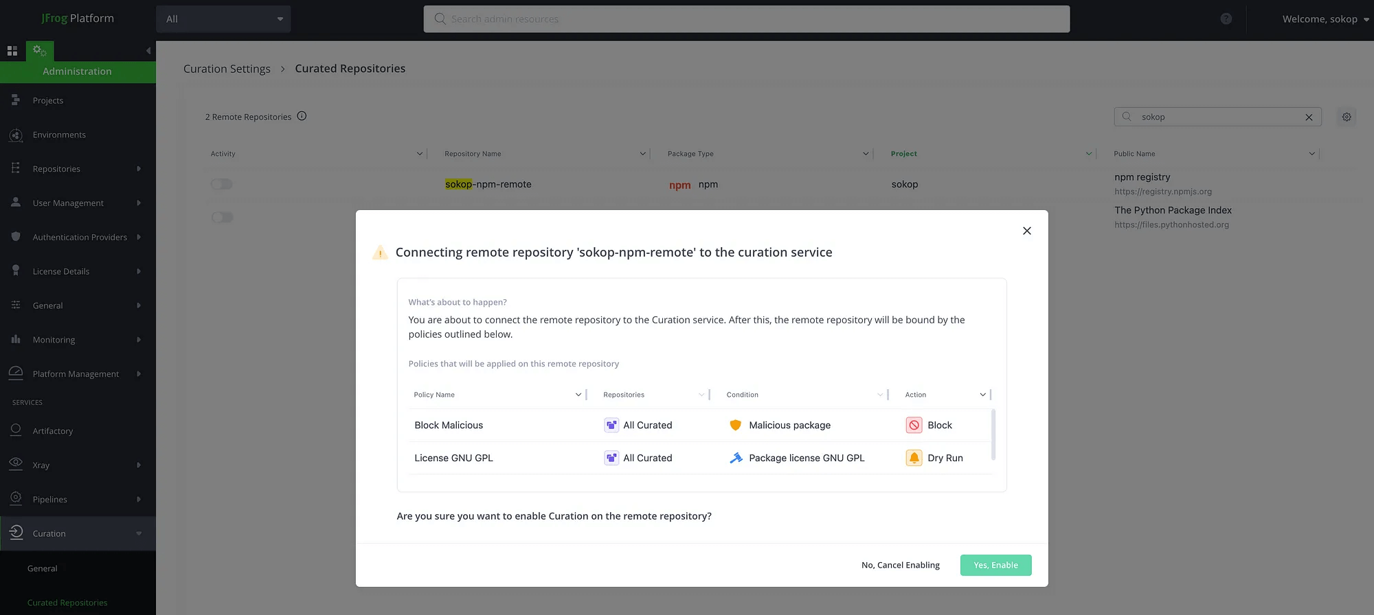 プラットフォームに定義済みのリモートリポジトリの一覧が表示されます。既に Curation が有効になっているリポジトリは、トグルが Active になっています。無効なリポジトリを有効にしようとすると、既に定義済みのポリシーが適用される旨、確認が入ります。