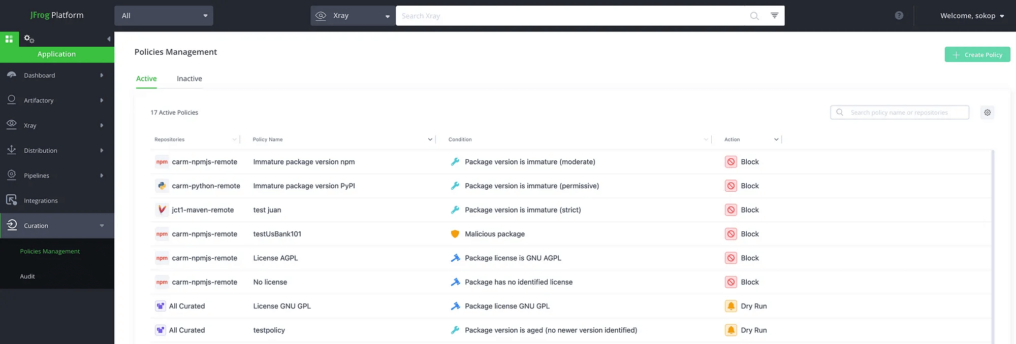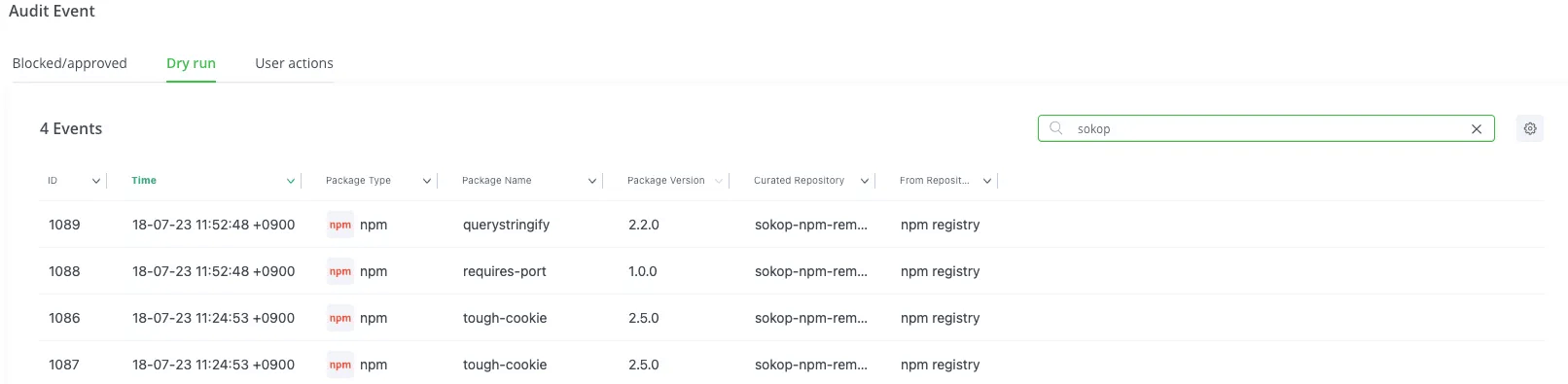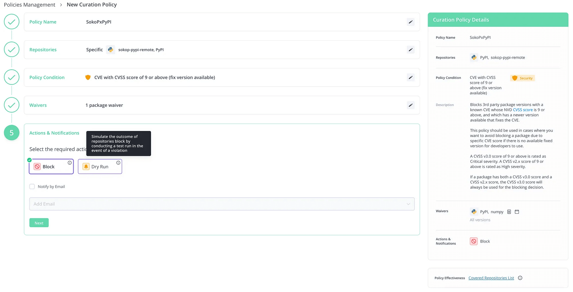 Block と Dry Run がありますが、Block は単にパッケージのダウンロードをブロックします。Dry Run はダウンロードはブロックせずにポリシーに違反したものをログで確認できますので、正式適用前の試行に用います。