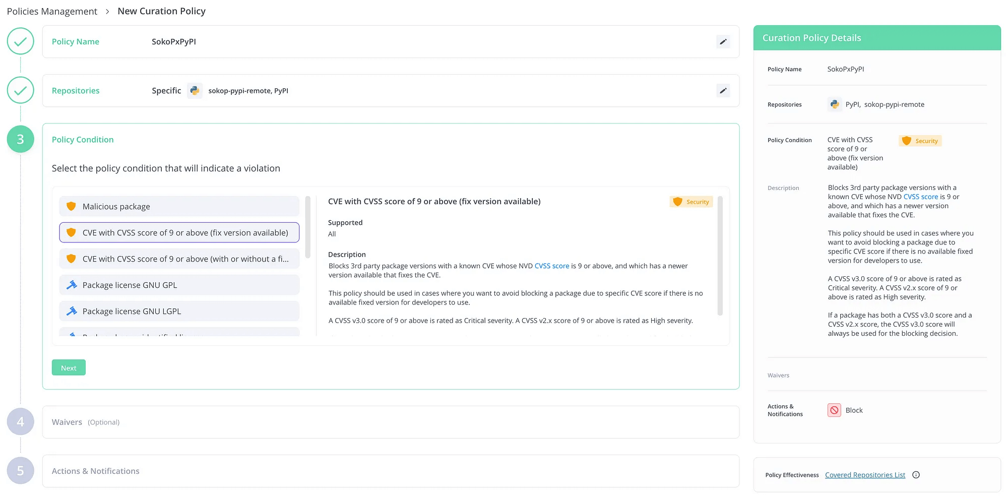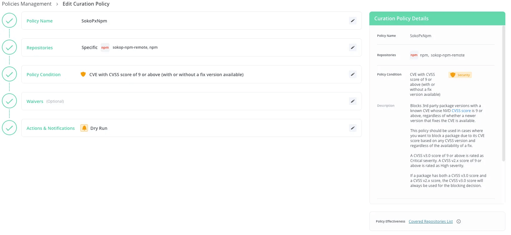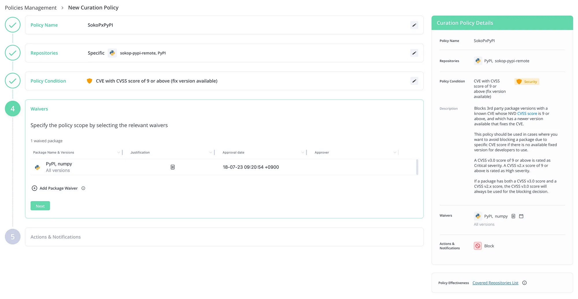 Block と Dry Run がありますが、Block は単にパッケージのダウンロードをブロックします。Dry Run はダウンロードはブロックせずにポリシーに違反したものをログで確認できますので、正式適用前の試行に用います。