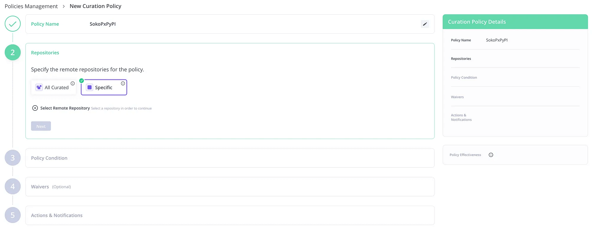 組織レベルで既にポリシーが定義されていて、プロジェクトレベルで新たなリモートリポジトリを追加した際などご想像ください。なおこの後ポリシーを追加しますが、その際にも対象リポジトリを選択可能です。ただし、指定可能なリポジトリはこの管理画面上でActive化されているリポジトリのみです。なので流れとしては