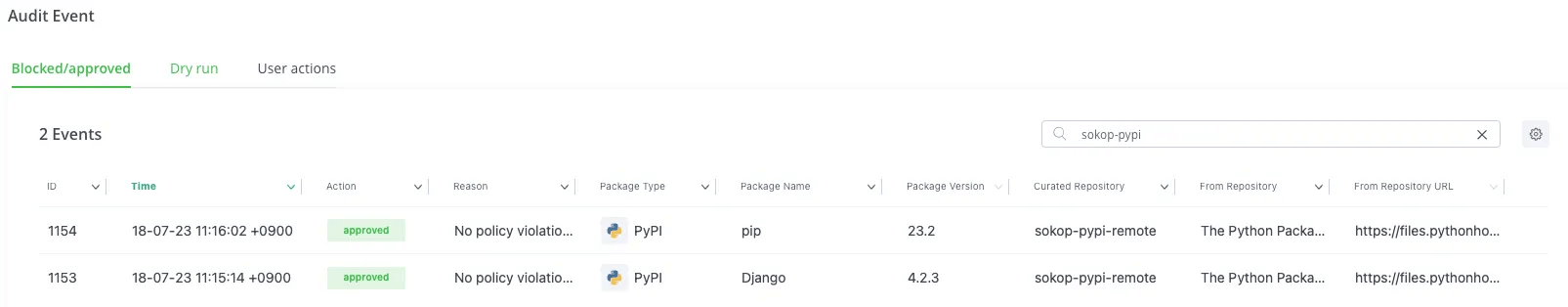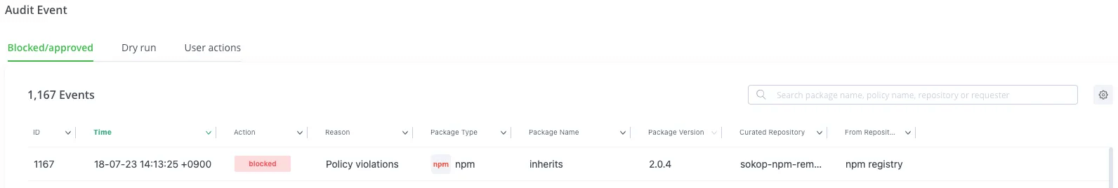 Curation 対象リポジトリでは、ポリシー対象外のパッケージでもダウンロードがAudit Eventに残ります。