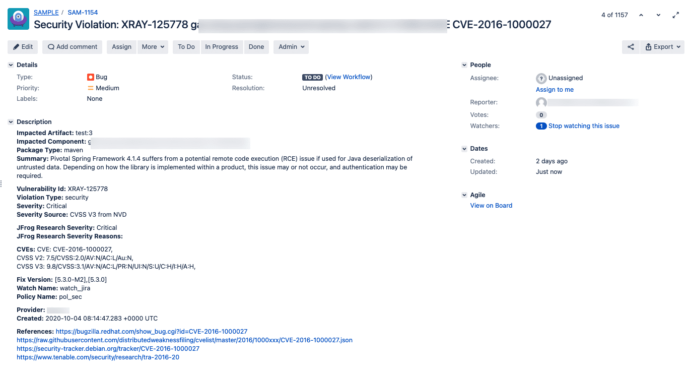 AtlassianのJiraとのインテグレーションにより、簡単な設定で、Xrayが検出したセキュリティ違反に基づいてJiraチケットを自動的に作成できます。これらの通知がJiraのUIに表示されることで、すでにJiraを使ってコード上の他の種類のバグのチケットを追跡・管理している開発者にとっては、より簡単で便利なものになります。