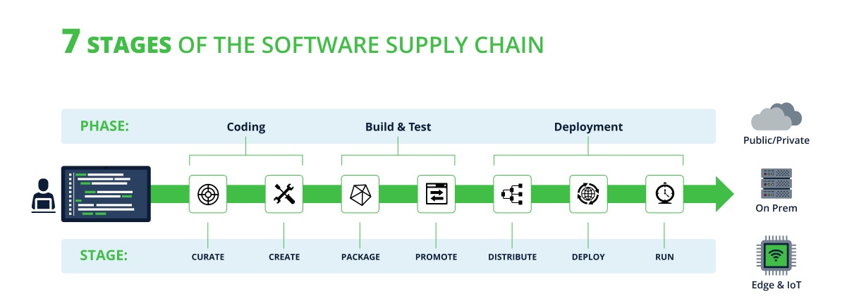 As most applications leverage Open Source and third party components in their applications, it’s important to realize that the software supply chain actually starts before a line of code is written, and ends with a consumer who benefits from the capabilities and features of the software. In terms of the software supply chain, there are three basic phases of software production: