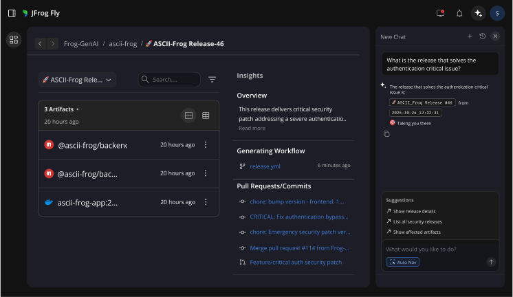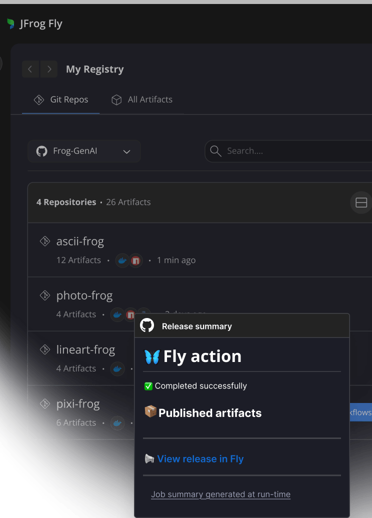JFrog Fly is tailor-made for the needs of small, AI-native dev teams and introduces a whole slew of new AI-native capabilities. JFrog Fly is built on top of the proven JFrog Platform services including Artifactory.