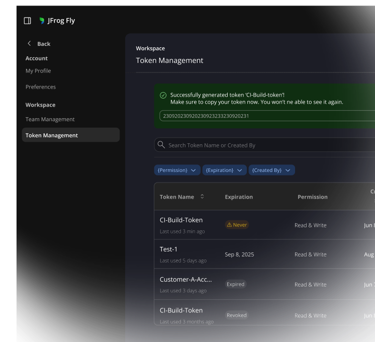 JFrog Fly was built by and for modern development teams who need a new AI-native way to store and distribute the software they’re creating. Teams with more enterprise needs, such as SSO or more advanced permissioning are better suited towards the full JFrog Platform.