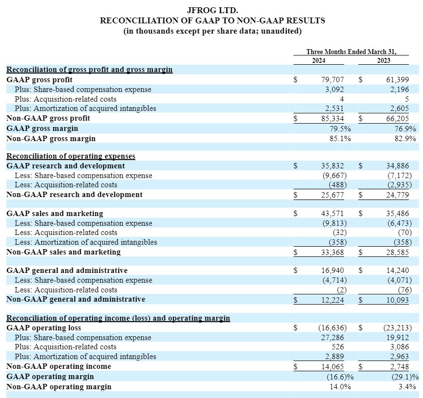 JFrog discloses the following non-GAAP financial measures in this release and the earnings call referencing this press release: non-GAAP operating income (loss), non-GAAP gross profit, non-GAAP gross margin, non-GAAP operating expenses (research and development, sales and marketing, general and administrative), non-GAAP operating margin, non-GAAP net income (loss), non-GAAP net income (loss) per diluted share, non-GAAP net income (loss) per basic share, and free cash flow. JFrog uses each of these non-GAAP financial measures internally to understand and compare operating results across accounting periods, for internal budgeting and forecasting purposes, for short- and long-term operating plans, and to evaluate JFrog’s financial performance. JFrog believes they are useful to investors, as a supplement to GAAP measures, in evaluating its operational performance, as further discussed below. JFrog’s non-GAAP financial measures may not provide information that is directly comparable to that provided by other companies in its industry, as other companies in its industry may calculate non-GAAP financial results differently, particularly related to non-recurring and unusual items. In addition, there are limitations in using non-GAAP financial measures because the non-GAAP financial measures are not prepared in accordance with GAAP and may be different from non-GAAP financial measures used by other companies and exclude expenses that may have a material impact on JFrog’s reported financial results.