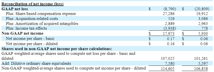Non-GAAP weighted average share count. Diluted GAAP and non-GAAP weighted-average shares are the same, except in periods that there is a GAAP loss and a non-GAAP income. The non-GAAP weighted-average shares used to compute the non-GAAP net income per share – diluted are adjusted to reflect dilution equal to the dilutive impact had there been GAAP income.