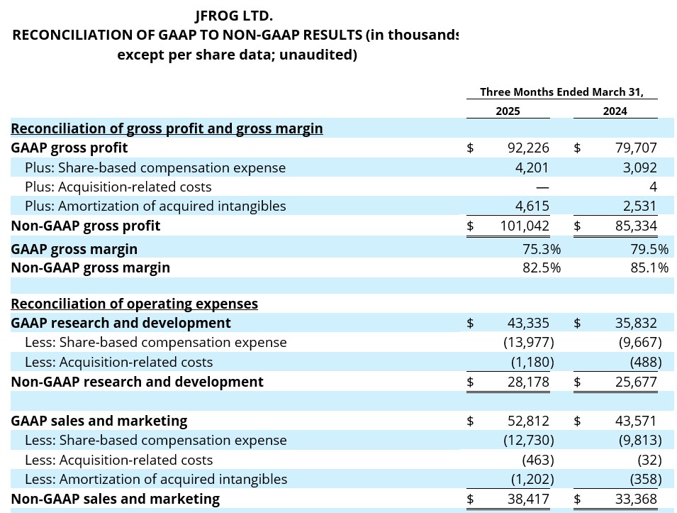 JFrog discloses the following non-GAAP financial measures in this release and the earnings call referencing this press release: non-GAAP operating income (loss), non-GAAP gross profit, non-GAAP gross margin, non-GAAP operating expenses (research and development, sales and marketing, general and administrative), non-GAAP operating margin, non-GAAP net income (loss), non-GAAP net income (loss) per diluted share, non-GAAP net income (loss) per basic share, and free cash flow. JFrog uses each of these non-GAAP financial measures internally to understand and compare operating results across accounting periods, for internal budgeting and forecasting purposes, for short- and long-term operating plans, and to evaluate JFrog’s financial performance. JFrog believes they are useful to investors, as a supplement to GAAP measures, in evaluating its operational performance, as further discussed below. JFrog’s non-GAAP financial measures may not provide information that is directly comparable to that provided by other companies in its industry, as other companies in its industry may calculate non-GAAP financial results differently, particularly related to non-recurring and unusual items. In addition, there are limitations in using non-GAAP financial measures because the non-GAAP financial measures are not prepared in accordance with GAAP and may be different from non-GAAP financial measures used by other companies and exclude expenses that may have a material impact on JFrog’s reported financial results.