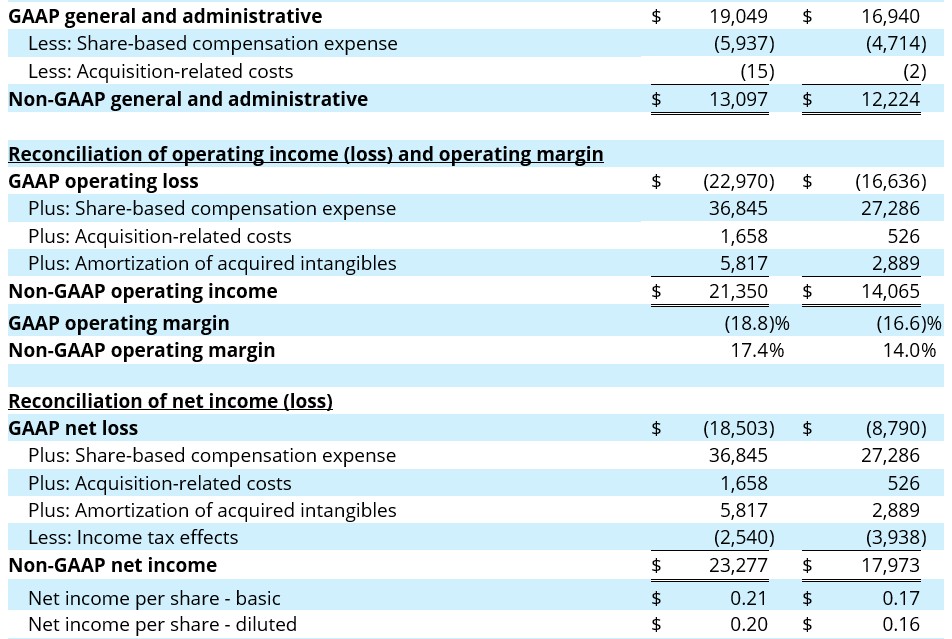 Non-GAAP financial measures should not be considered in isolation from, or as a substitute for, financial information prepared in accordance with GAAP. A reconciliation of the historical non-GAAP financial measures to their most directly comparable GAAP measures has been provided in the financial statement tables included below in this press release. A reconciliation of non-GAAP guidance measures to corresponding GAAP measures is not available on a forward-looking basis without unreasonable effort due to the uncertainty regarding, and the potential variability of, reconciling items that may be incurred in the future such as share-based compensation, the effect of which may be significant.