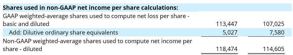 Non-GAAP weighted average share count. Diluted GAAP and non-GAAP weighted-average shares are the same, except in periods that there is a GAAP loss and a non-GAAP income. The non-GAAP weighted-average shares used to compute the non-GAAP net income per share – diluted are adjusted to reflect dilution equal to the dilutive impact had there been GAAP income.