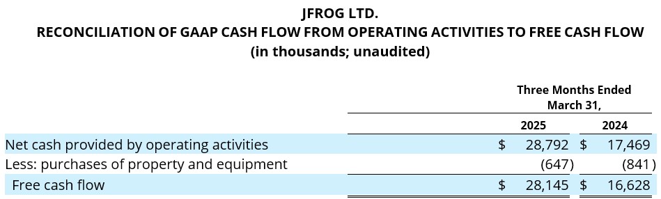 JFrog defines non-GAAP gross profit, non-GAAP operating expenses (research and development, sales and marketing, general and administrative), non-GAAP gross margin, non-GAAP operating margin, non-GAAP operating income (loss) and non-GAAP net income (loss) as the respective GAAP balances, adjusted for, as applicable: (1) share-based compensation expense; (2) the amortization of acquired intangibles; (3) acquisition-related costs; and (4) income tax effects. JFrog defines free cash flow as Net cash provided by (used in) operating activities, minus capital expenditures. Investors are encouraged to review the reconciliation of these historical non-GAAP financial measures to their most directly comparable GAAP financial measures.