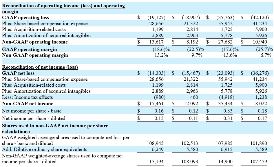 Non-GAAP financial measures should not be considered in isolation from, or as a substitute for, financial information prepared in accordance with GAAP. A reconciliation of the historical non-GAAP financial measures to their most directly comparable GAAP measures has been provided in the financial statement tables included below in this press release. A reconciliation of non-GAAP guidance measures to corresponding GAAP measures is not available on a forward-looking basis without unreasonable effort due to the uncertainty regarding, and the potential variability of, reconciling items that may be incurred in the future such as share-based compensation, the effect of which may be significant.
