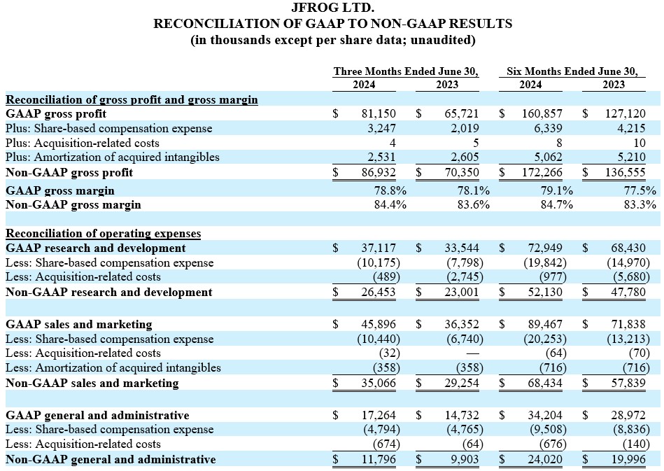 JFrog discloses the following non-GAAP financial measures in this release and the earnings call referencing this press release: non-GAAP operating income (loss), non-GAAP gross profit, non-GAAP gross margin, non-GAAP operating expenses (research and development, sales and marketing, general and administrative), non-GAAP operating margin, non-GAAP net income (loss), non-GAAP net income (loss) per diluted share, non-GAAP net income (loss) per basic share, and free cash flow. JFrog uses each of these non-GAAP financial measures internally to understand and compare operating results across accounting periods, for internal budgeting and forecasting purposes, for short- and long-term operating plans, and to evaluate JFrog’s financial performance. JFrog believes they are useful to investors, as a supplement to GAAP measures, in evaluating its operational performance, as further discussed below. JFrog’s non-GAAP financial measures may not provide information that is directly comparable to that provided by other companies in its industry, as other companies in its industry may calculate non-GAAP financial results differently, particularly related to non-recurring and unusual items. In addition, there are limitations in using non-GAAP financial measures because the non-GAAP financial measures are not prepared in accordance with GAAP and may be different from non-GAAP financial measures used by other companies and exclude expenses that may have a material impact on JFrog’s reported financial results.