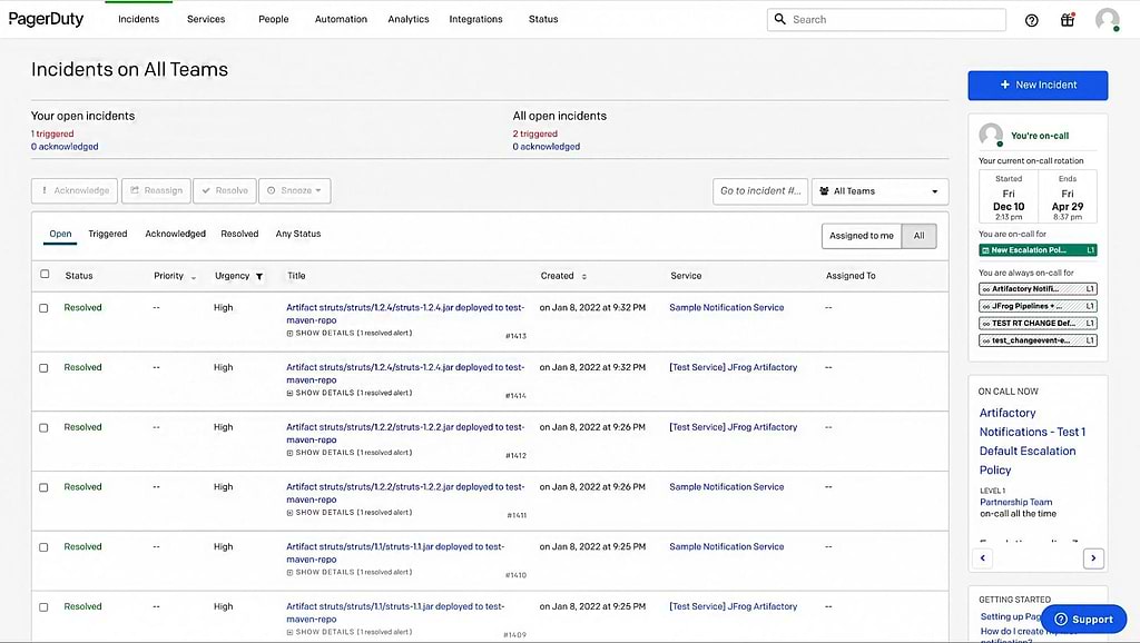With JFrog integrations for PagerDuty, incident teams can direct an early response by the right person to resolve DevOps, security, and change events as they occur.