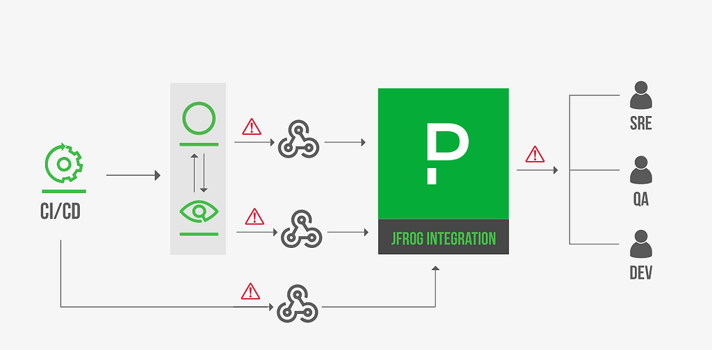 - Quality Assurance – QA teams can configure Xray policies and watches to monitor targeted artifact repositories used for test and staging environments, and report security violations through PagerDuty incident services for prompt resolution.