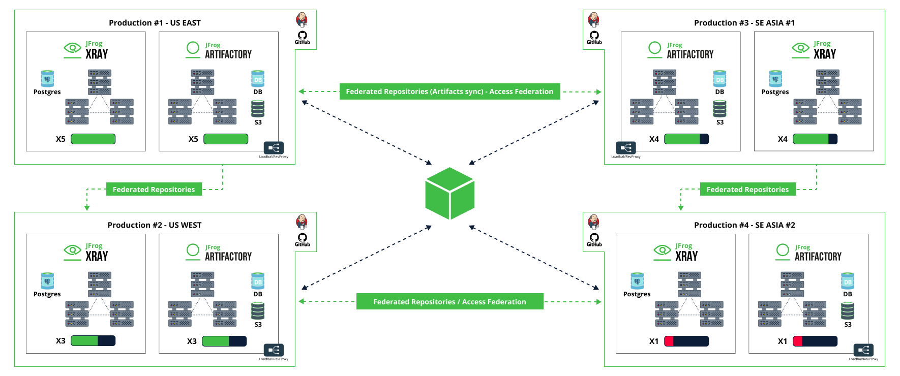- Federated repositories based on JFrog’s innovative technology for bidirectional mirroring between enterprise repositories in different installations of Artifactory can fulfill a mesh topology across multiple sites.